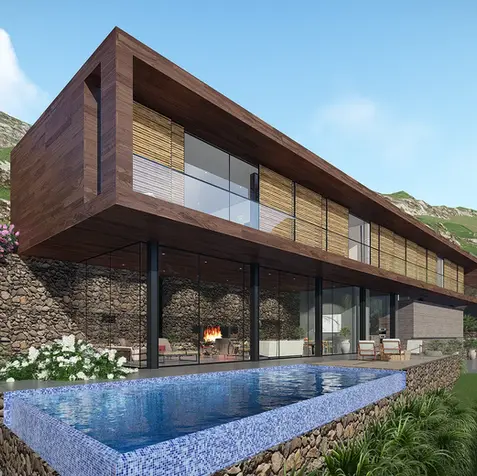 Esta vivienda se desarrolla sobre una ladera. Debido al poco fondo y gran frente del lote, la propuesta toma la forma de un gran pabellón longitudinal suspendido sobre el terreno, el cual alberga en fila cada uno de los espacios íntimos de la casa para aprovechar las visuales hacia el valle. Debajo de este, se ubican las áreas sociales con un cerramiento de vidrio que las vincula con el tratamiento paisajista de los jardines y terrazas. El gran volumen se reviste completamente con madera para crear una sensación de calidez campestre y se apoya sobre un gran fondo de piedra que se mimetiza con la topografía natural del terreno.