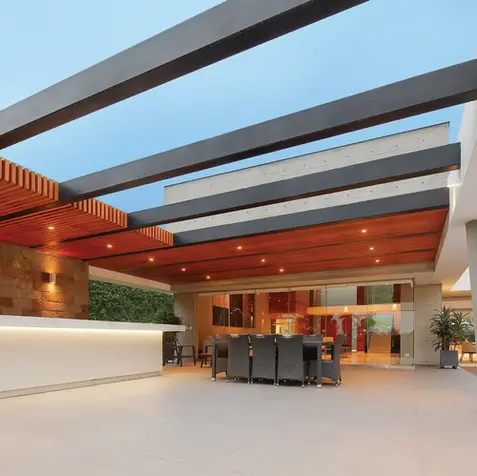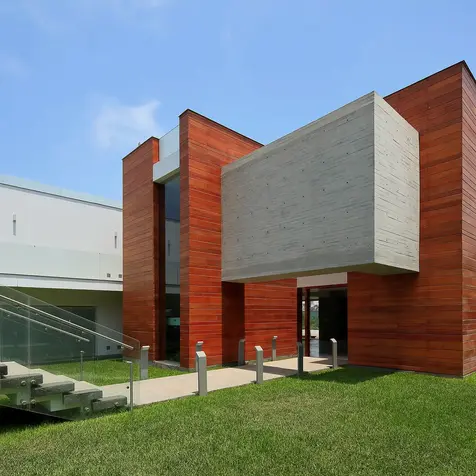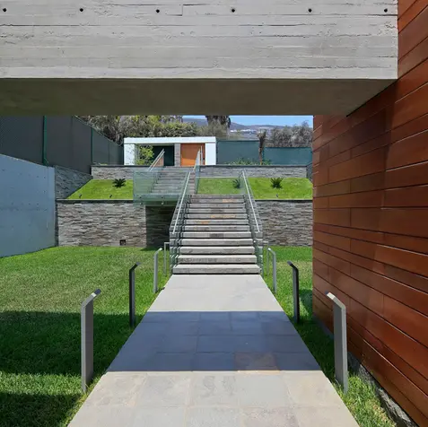 Two-floor urban house located in Casuarinas. The main entrance, from the upper level, has great open-air stairs that go down towards the house’s social area accompanying the natural land’s topography. The exposed concrete and wooden blocks that enclose the main spaces are articulated through a white band of concrete that in some occasions complies the function of spatial enclosure and, in others, coverage.
