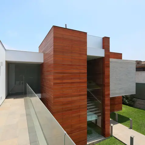 Vivienda de dos pisos situada en Casuarinas. El ingreso principal desde el nivel superior posee una gran escalera a cielo abierto que baja hacia la zona social de la casa acompañando la topografía natural del terreno. Los bloques de concreto expuesto y de madera, que encierran los espacios principales, se articulan a través de una cinta blanca de concreto, que en unas ocasiones cumple la función de cerramiento espacial y, en otras, de cobertura.