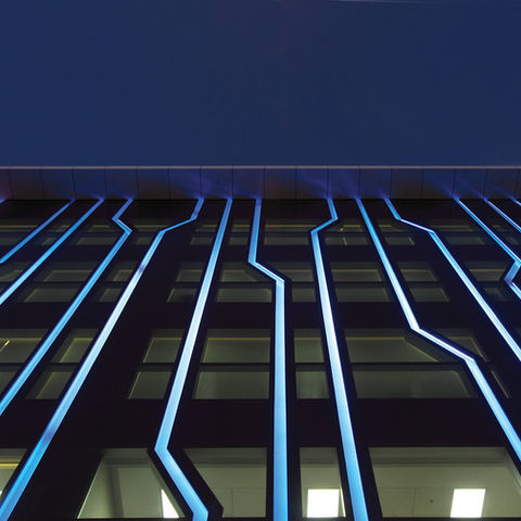 La expresión del proyecto incluye una gran pantalla que es la abstracción de un tema tecnológico, en la cual se aplica un tratamiento de luz programada en una piel de vidrio. Esta trasmite el quehacer tecnológico de la casa educativa.