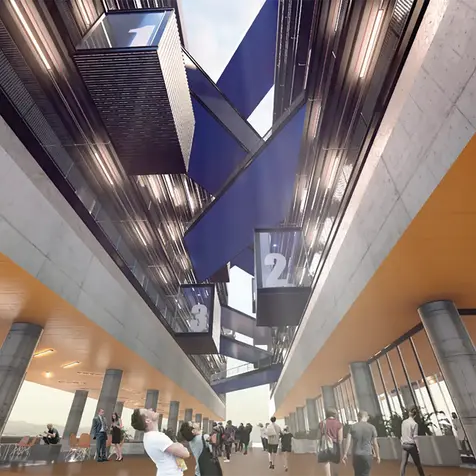 The volumes are connected through blue-painted metallic bridges –the institution’s representative color–, which offers a dynamic character to the inside space together with the rest areas hanging from the corridors as containers.