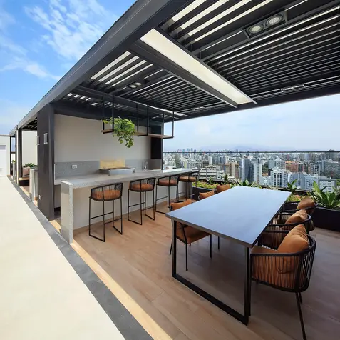 With a harmonious design that integrates with the local aesthetics, the project stands out for rising above the street level, incorporating setbacks and differentiated facades. The creative use of patterns and colors, along with nighttime lighting, makes it an architectural landmark and establishes an emotional connection with the residents. The common areas, conceived as extensions of the apartments, offer spaces such as a pool, terraces, and a gym with impressive views of the district. Every detail of the ensemble has been planned to encourage community interactions.
