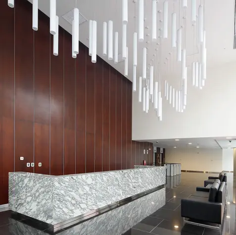 This twenty-floor tower is located within a dividing lot and is distanced from its neighbors in order to have four façades and thus naturally illuminate a larger surface inside. The rounded edges and the variation of the plant per floor create a dynamic and very attractive volume.