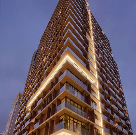 Propuesta arquitectónica innovadora que busca elevar el estándar de residencias. Inspirado en las grandes ciudades, destaca por su arquitectura distintiva, vistas panorámicas hacia el parque y el mar, y una fachada contemporánea con paneles de tratamiento tipo madera, que aportan elegancia y sofisticación. Enfocado en la construcción de comunidad, el proyecto promueve la integración entre residentes. Por la noche, se convierte en un ícono gracias a su propuesta de iluminación de acento. Una propuesta que redefine el concepto de residencia en la ciudad con un enfoque cosmopolita.